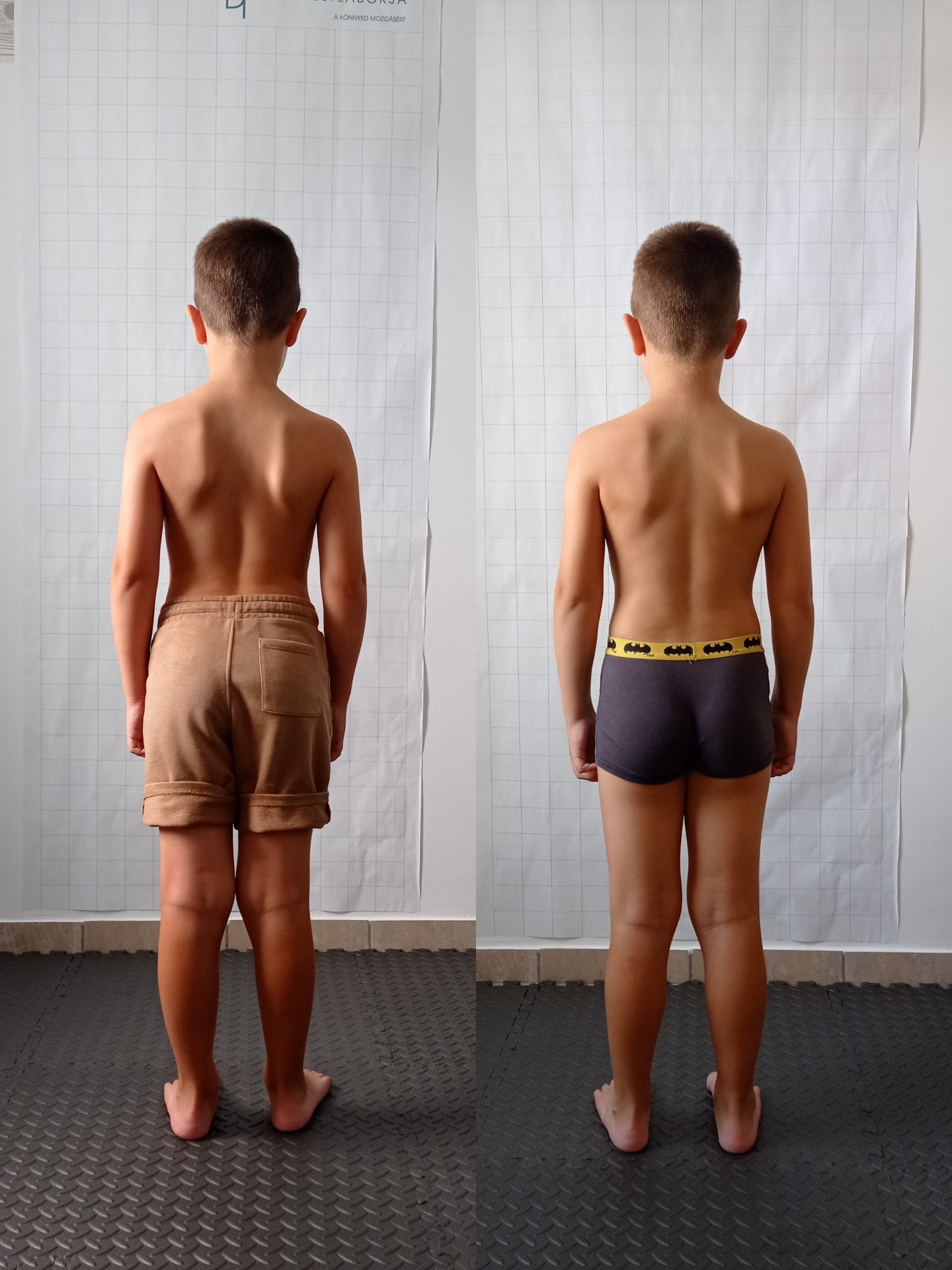 Egyik legszorgalmasabb kis vendégem, akivel négy hónapja dolgozunk együtt. A bal oldali fotó a kezdeti állapotot mutatja, azt, ahogy ő akkor függőlegesnek érezte magát. A jobb oldali fotó a 10. találkozásunkkor készült. Azóta is találkozunk hetente egyszer, hogy tovább ügyesedjen a mindennapi mozgásokban és a sportjában is annak érdekében, hogy minél kisebb valószínűséggel forduljon elő súlyos sérülés. Nagyon büszke vagyok rá!